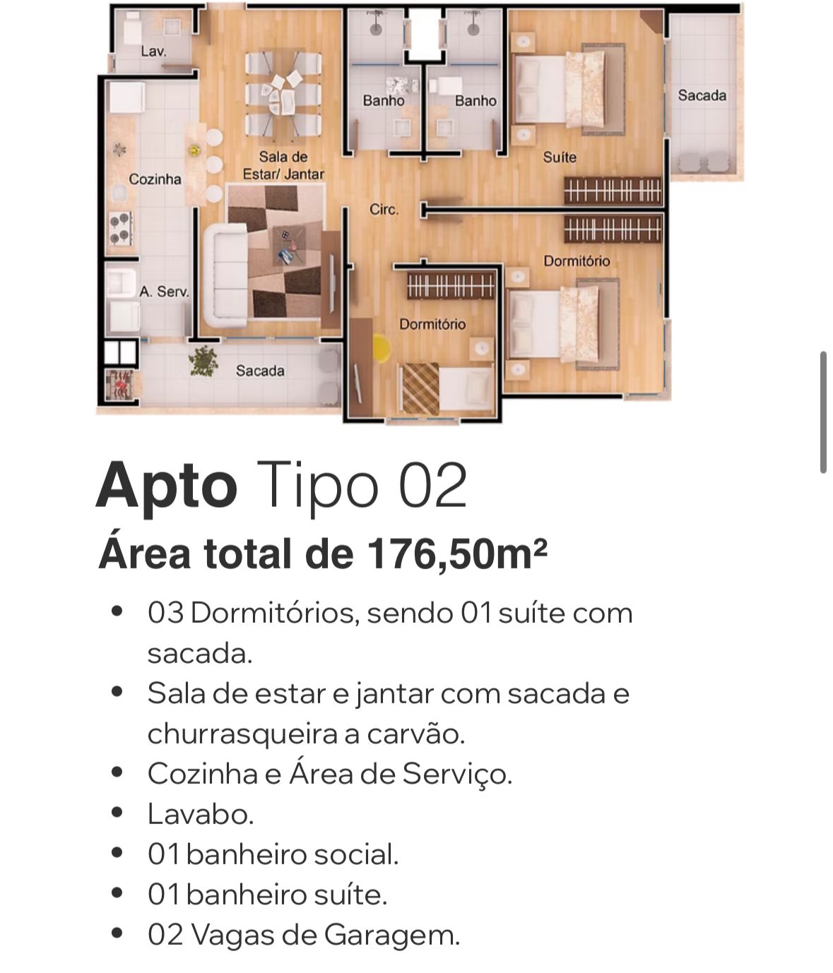 - Sala de estar e jantar com sacada e churrasqueira a carvão.