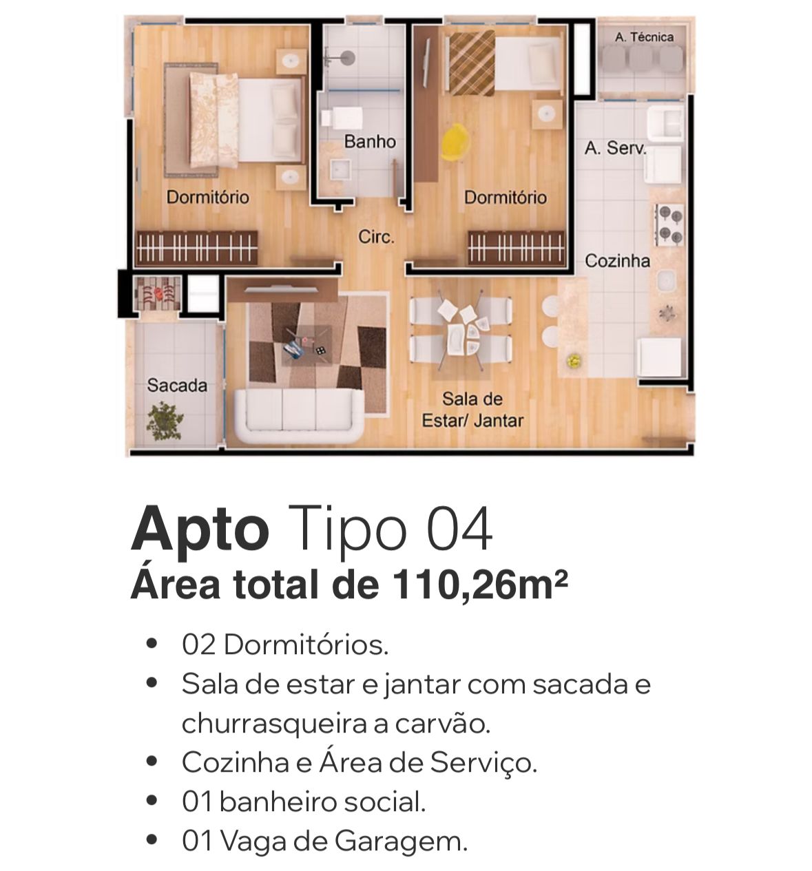 - Sala de estar e jantar com sacada e churrasqueira a carvão.